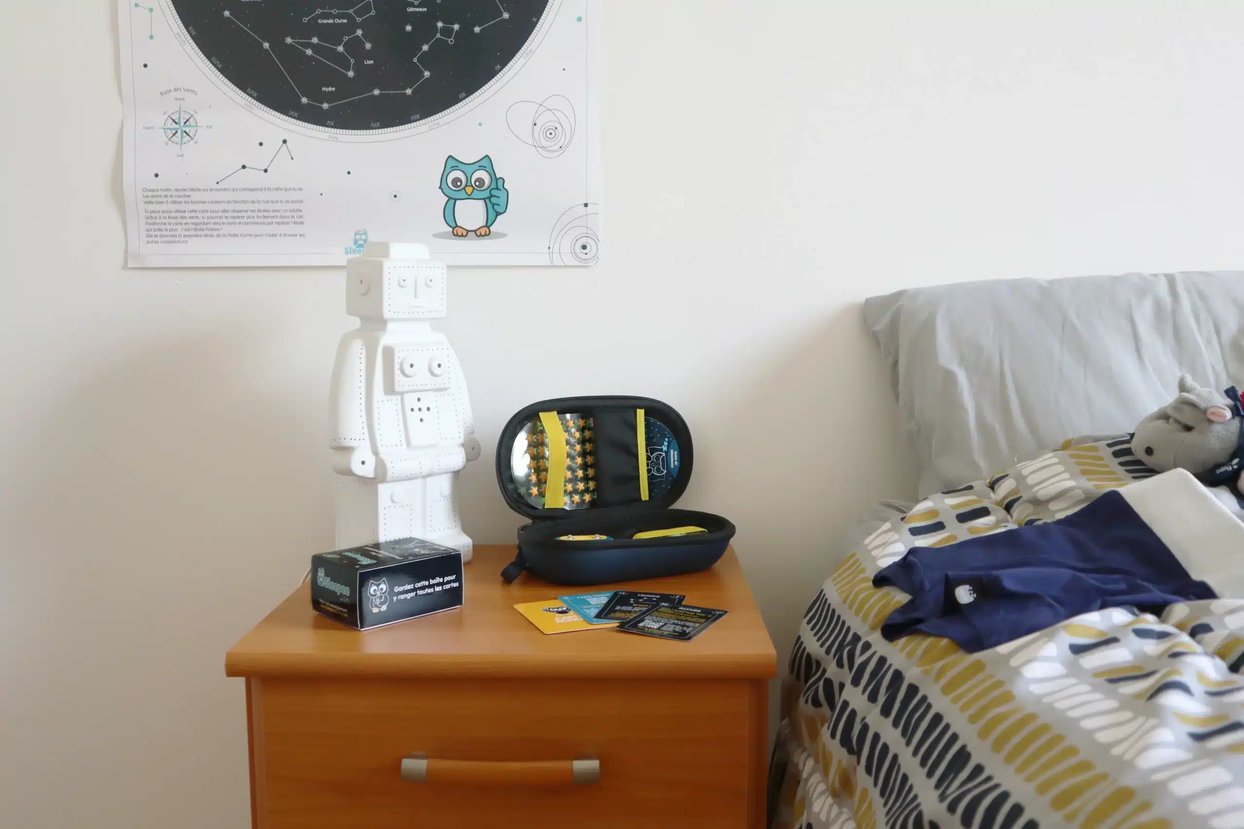 Échanges personnalisés avec l’équipe, application mobile (calendrier mictionnel), jeu d’aventure par cartes, poster carte céleste, et le dispositif d’alarme en location.